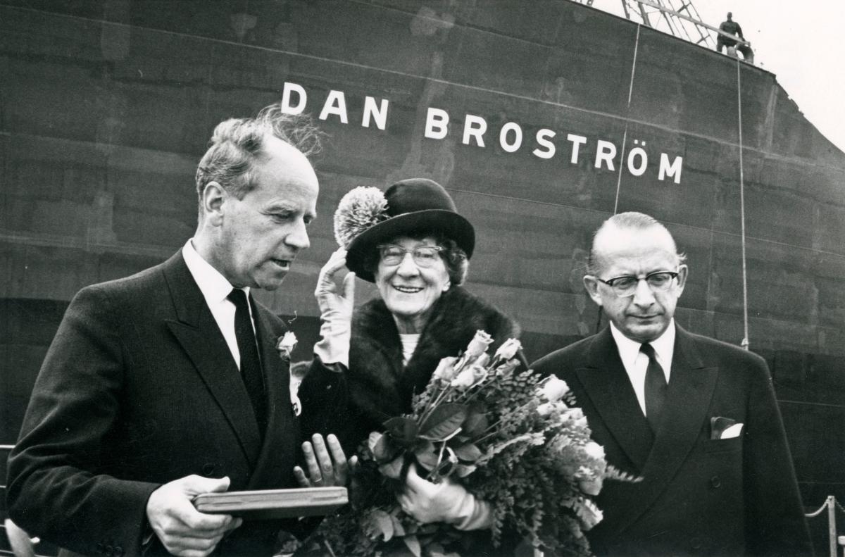 Eriksbergschefen Sven Häggqvist, Ann-Ida Broström och Dan-Axel Broström framför oljetankfartyget DAN BROSTRÖM, vilket var döpt efter Ann-Idas make. Fotografiet taget 24 september 1963 i samband med fartygets sjösättning vid Eriksbergs mekaniska verkstad i Göteborg.
