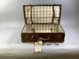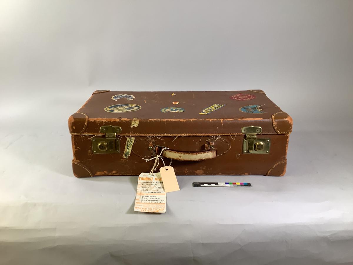 Resväska använd av Werner Klint vid resa med KUNGSHOLM. Utsidan dekorerade med flera olika klistermärken. En bagageetikett från SAL sitter fast på handtaget. Inuti sitter på pins.