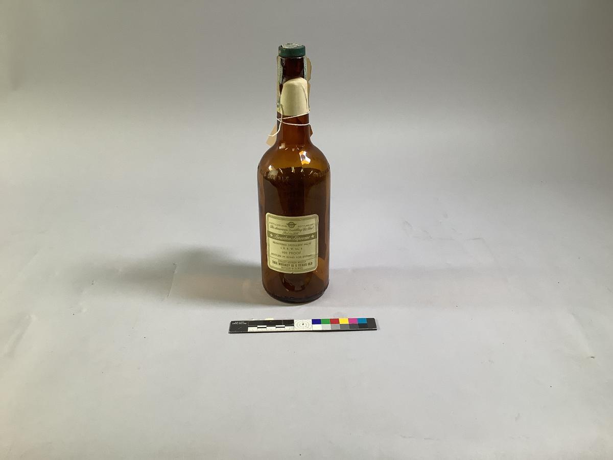Flaska (nu tom) som innehållit bourbon av Svenska Amerika Liniens eget märke. Hemförd av Werner Klint från resa med KUNGSHOLM eller GRIPSHOLM.