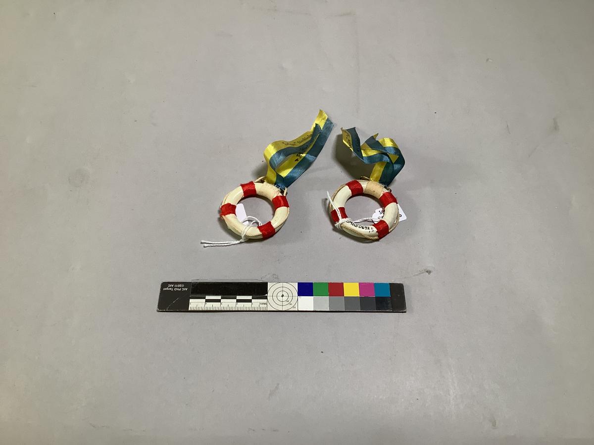 Två identiska livbojar i miniformat, i trä med textildetaljer i blått, gult, vitt och rött. Blågult band med texten: "Livbojen" Stockholm M/S Gripsholm. Såldes som brosch ombord GRIPSHOLM till förmån för Sjöräddningssällskapet.