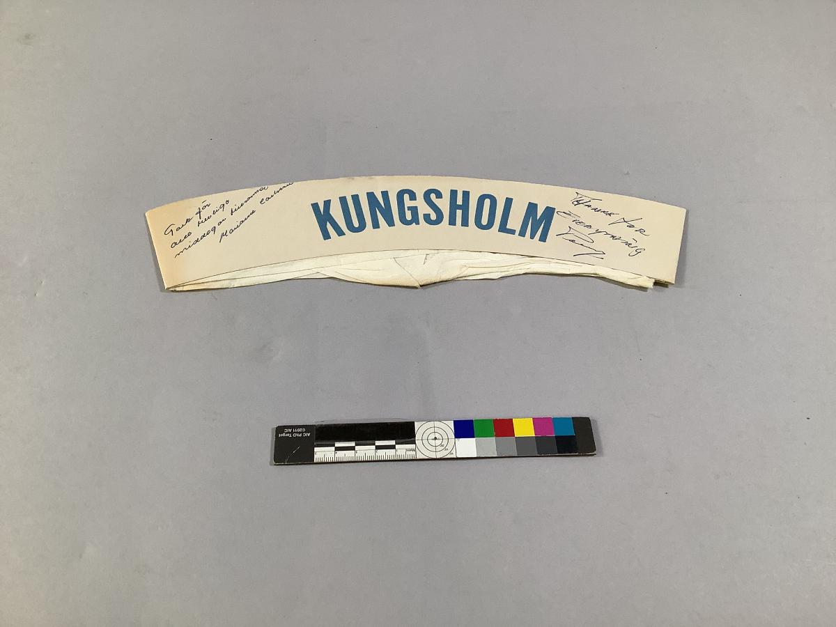 Sjömansmössa av vitt papper och kartong med texten "Kungsholm" i blått. Även handskrivna autografer från flera av brukaren Werner Klints medresenärer