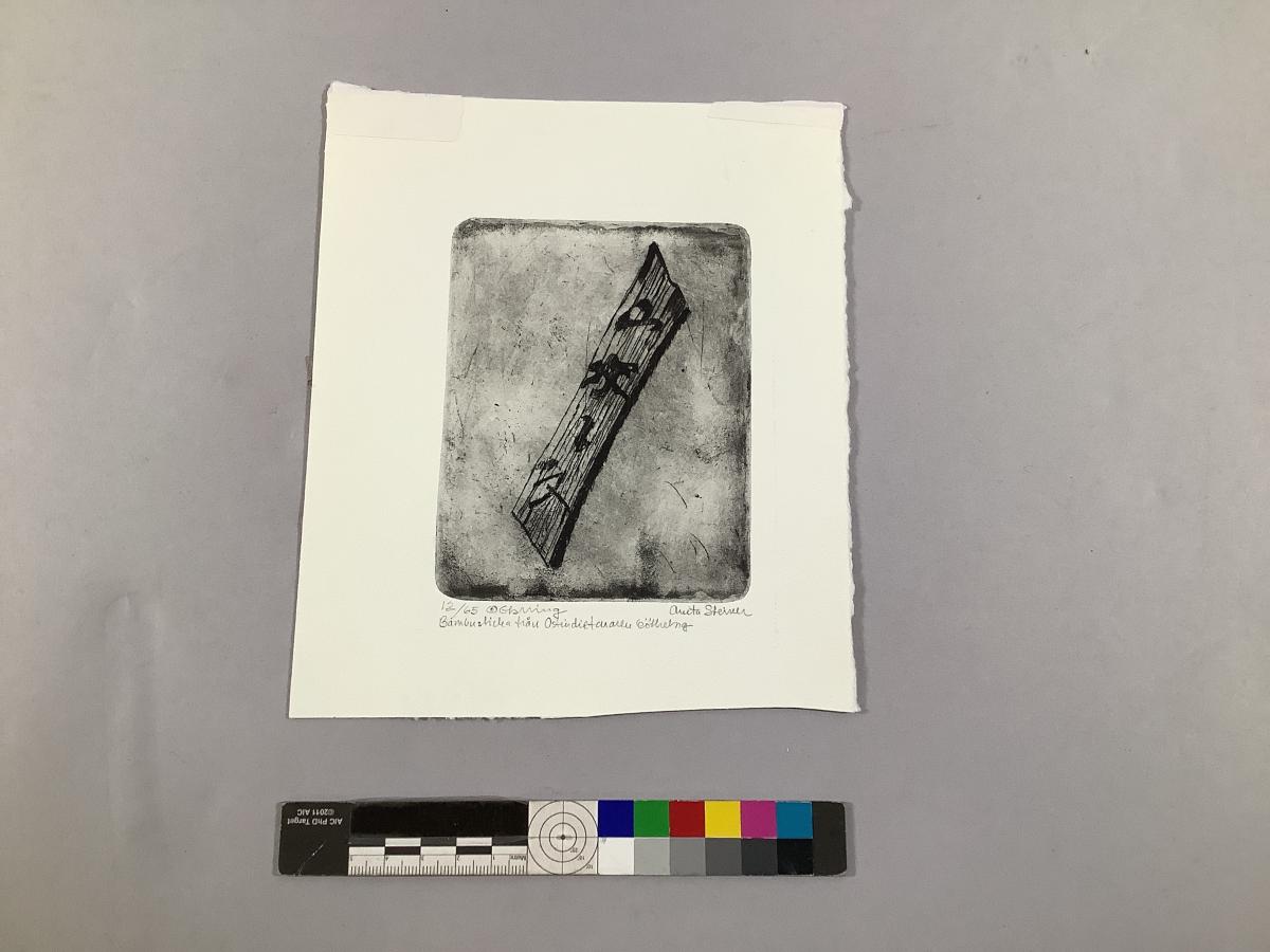 Etsning (nr 12 av 65) föreställande en bambusticka med kinesiska tecken från GÖTHEBORG, av Anita Bergendal Steiner. Det kan vara en avbildning av SMG43700, 7291. Liknande motiv finns som teckning, se SMG50737.