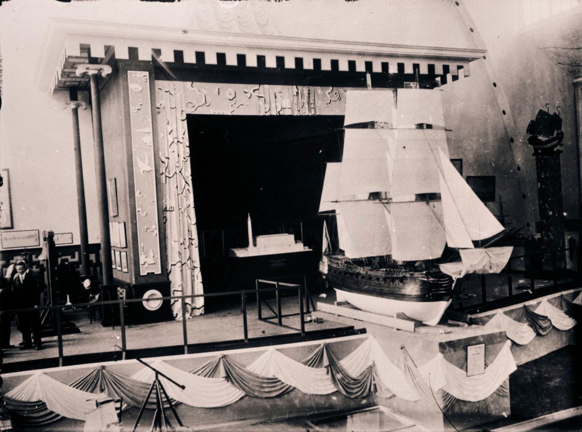 Ostindiska kompaniets minnesutställning, vilken Sjöfartsmuseet arrangerade i Lisebergs kongresshall 15 augusti -16 september 1931. Bilden visar fondpartiet inklusive modellen av FINLAND