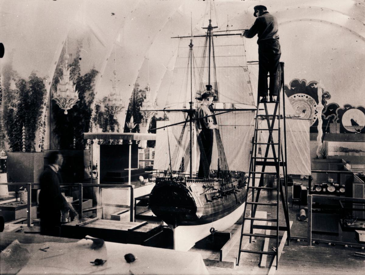 Flera personer arbetar med riggen på modellen av FINLAND. Bilden är tagen inför Ostindiska kompaniets minnesutställning, vilken Sjöfartsmuseet arrangerade i Lisebergs kongresshall 15 augusti -16 september 1931