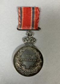 Krönt medalj i silver avbildar Norges kung Haakon VII i band i Norges färger. Baksidan lagerkrans med orden FOR AEDEL DAAD. Norsk livräddningsmedalj