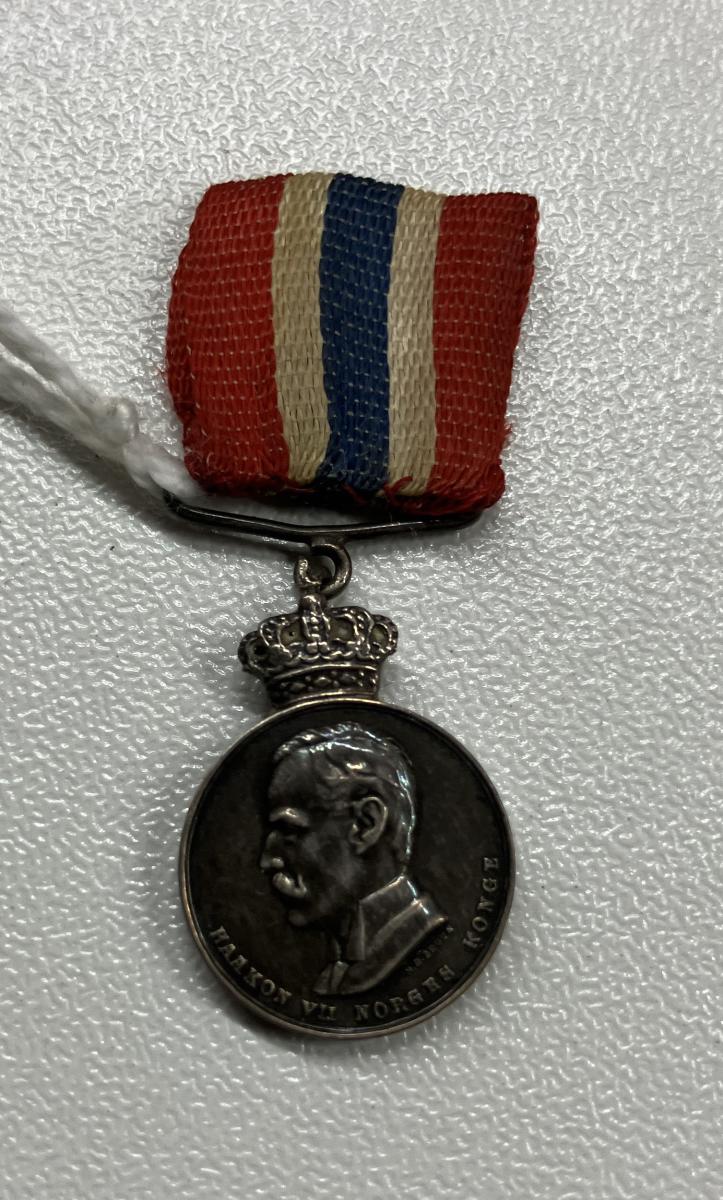 Liten version av krönt medalj i silver avbildar Norges kung Haakon VII i band i Norges färger. Baksidan lagerkrans med orden FOR AEDEL DAAD.