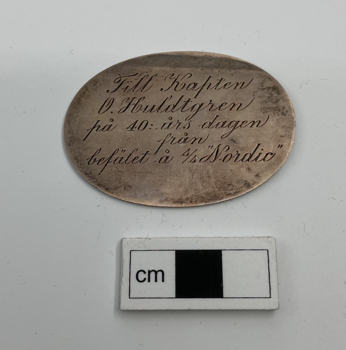 Minnesplakett i silver till Kapten O Huldtgren på 40-års dagen från befälet å s/s "Nordic"