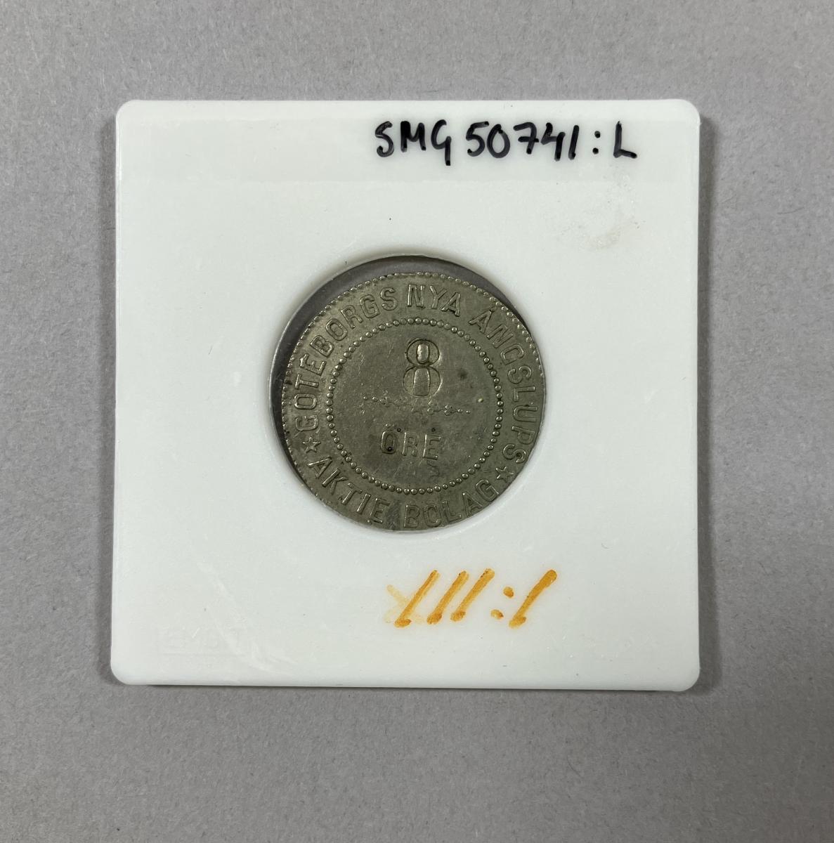 En pollett 8 öre för, Göteborgs Nya ångslups aktiebolag, förvarad i plastfodral.