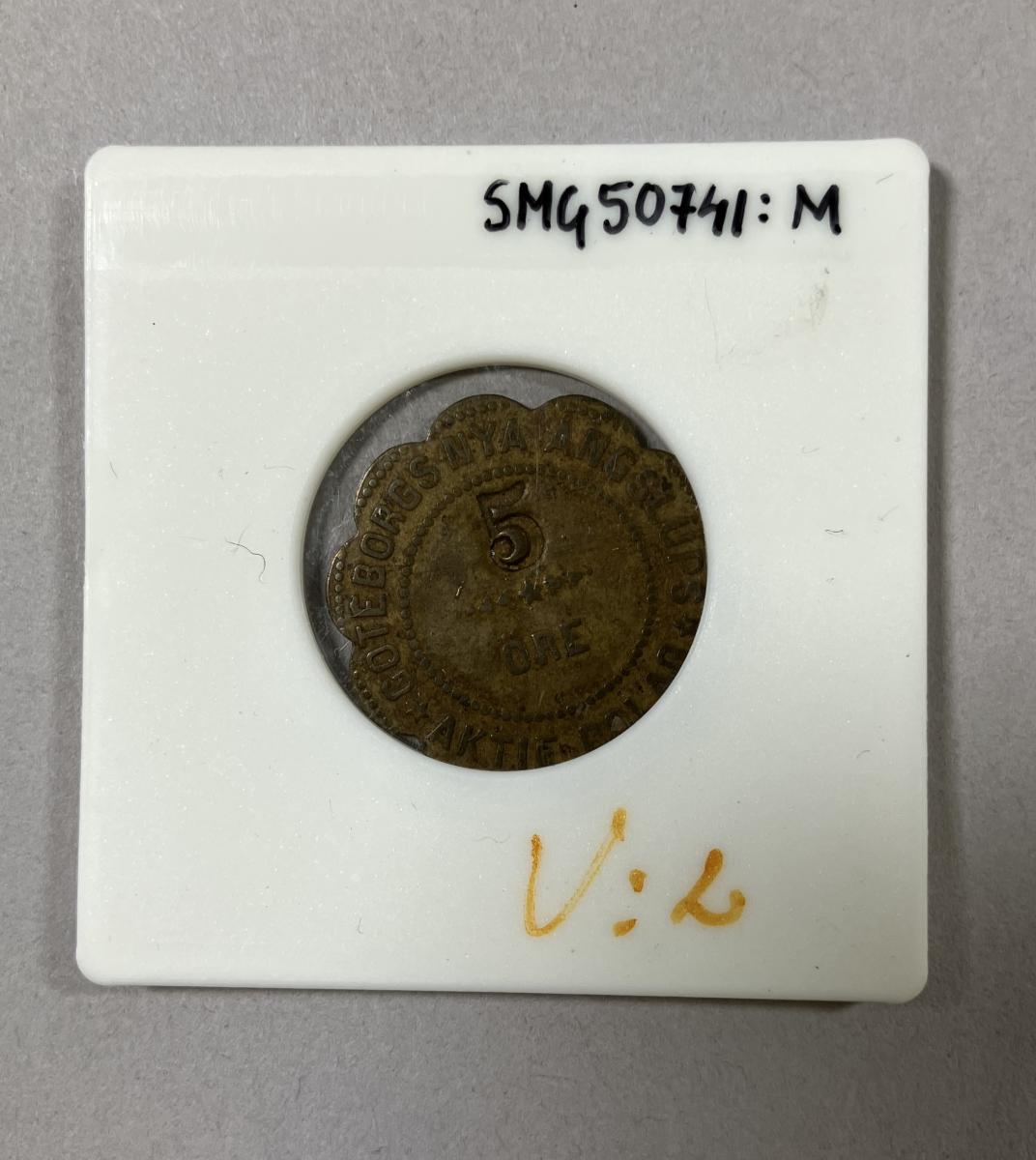 En pollett 5 öre för, Göteborgs Nya ångslups aktiebolag, förvarad i plastfodral.