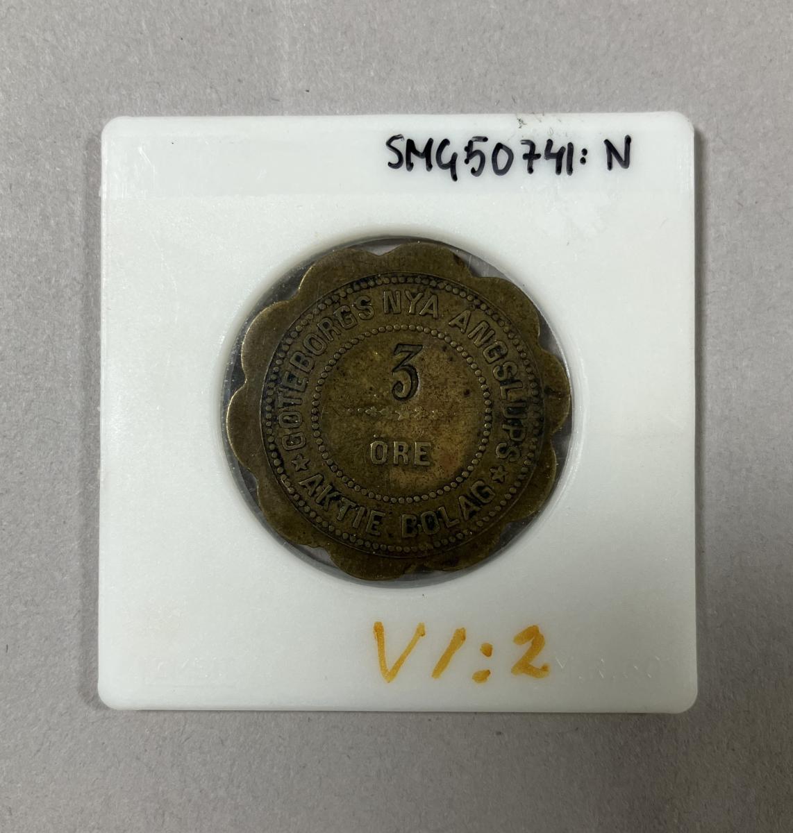 En pollett 3 öre för, Göteborgs Nya ångslups aktiebolag, förvarad i plastfodral.