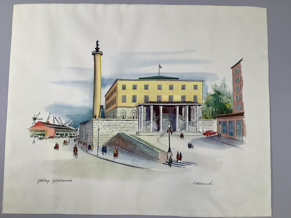 Vy över Sjöfartsmuseet utförd i akvarell på akvarellpapper.