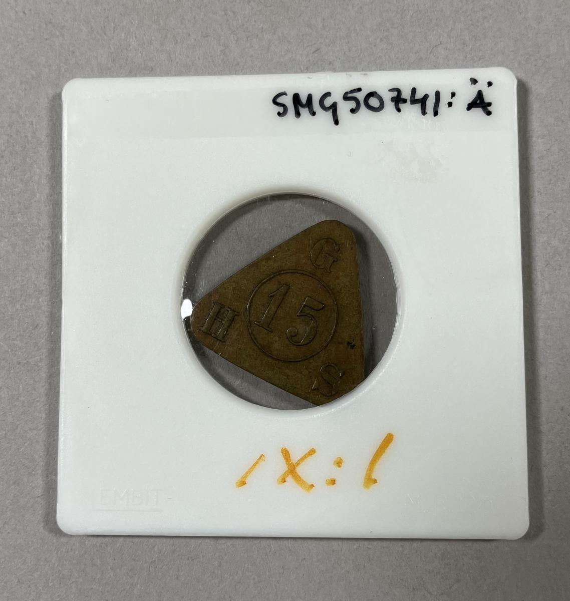 En triangelformad pollett för färjetrafik, präglad GHS 15 Göteborgs hamn styrelse, förvarad i plastfodral.