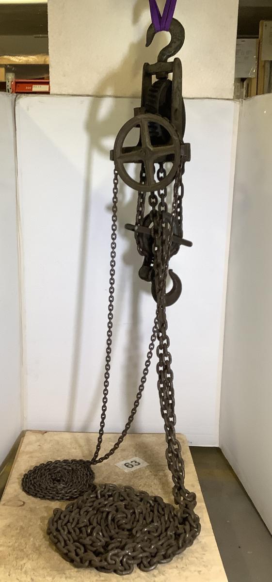 Kättingens dimensioner Diam 1,4 och 0,6 cm. Lyftblock: Lyftkapacitet 2,5 ton. Vanlig i verstäderna före traversens tid. Handkättingshjul, lastkättingshjul, krok nedtill och upptill.
